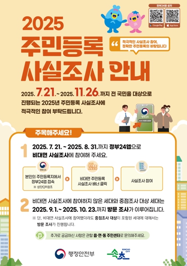 [뉴스스텝] 속초시는 주민등록정보의 정확성을 높이고 공정한 행정·복지 서비스를 제공하기 위해 7월 21일부터 11월 26일까지 ‘2025년 주민등록 사실조사’를 실시한다.