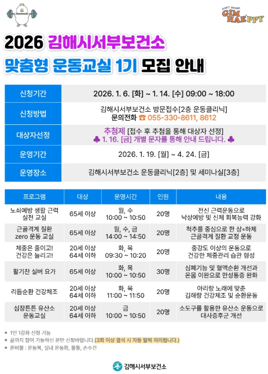 [뉴스스텝] 김해시서부보건소에서 1월 6일부터 14일까지 『2026년 맞춤형 운동교실 1기』 신규 참여자를 모집한다.