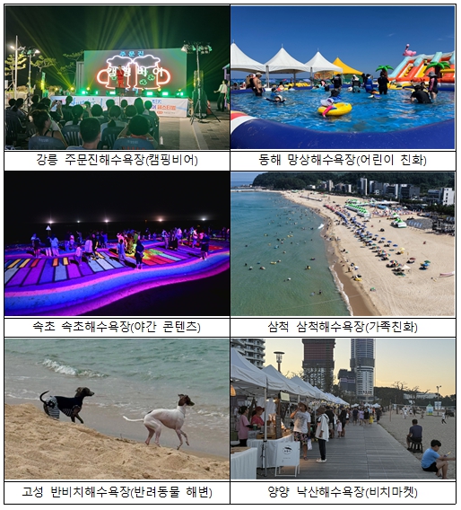 (강릉) 주문진 캠핑비어 해수욕장, (동해) 망상 어린이 친화 해수욕장, (속초) 야간 콘텐츠 해수욕장, (삼척) 가족 친화 해수욕장, (고성) 반비치 반려동물 해수욕장, (양양) 낙산 해수욕장 비치마켓