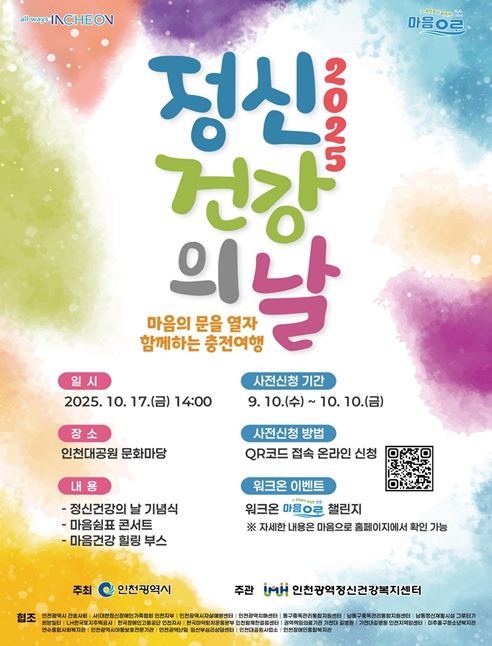 [뉴스스텝] 인천광역시는 10월 17일 인천대공원 문화마당에서 ‘마음의 문을 열자, 함께하는 충전 여행’이란 주제로‘2025년 정신건강의 날 기념행사’를 개최한다.