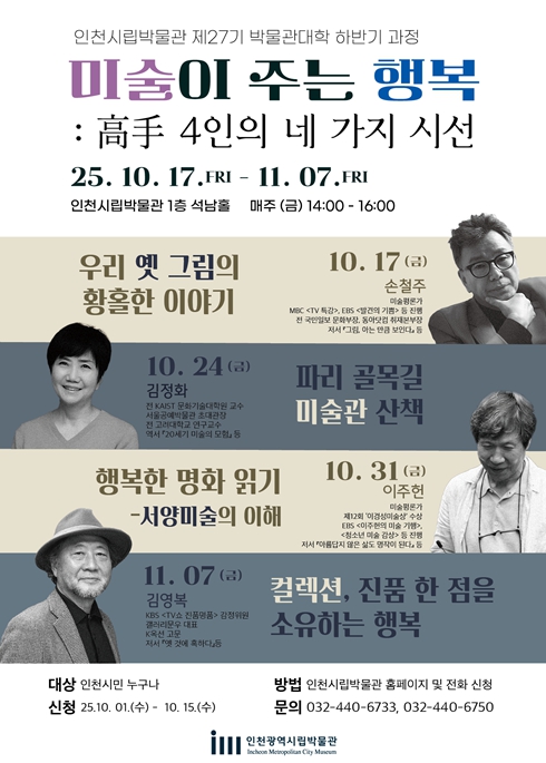 김태익 인천시 시립박물관장은 “이번 박물관대학은 각기 다른 분야의 고수들이 시민과 가까이에서 미술을 이야기하는 보기 드문 기회”라며 “특히 첫 강의는 옛 그림의 즐거움과 인문적 깊이를 한자리에서 체험할 수 있는 뜻깊은 시간이 될 것”이라고 말했다.
