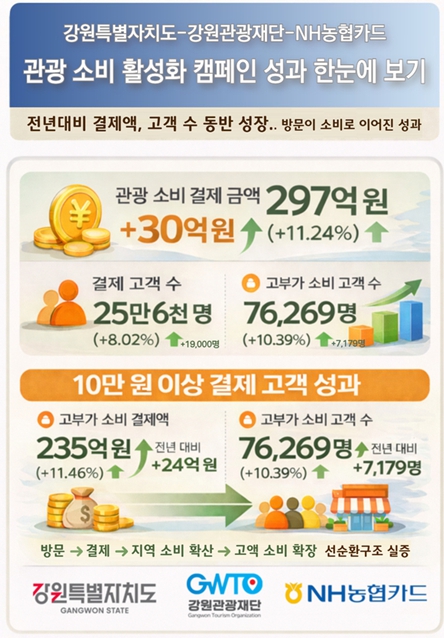 [뉴스스텝] 강원특별자치도와 강원관광재단은 NH농협카드와 함께 추진한 ‘강원 관광소비 활성화 상생 캠페인’ 결과, 전년 동일 기간 대비 관광 소비 금액과 결제 고객 수가 모두 증가하며 실질적인 지역 소비 활성화 성과를 거둔 것으로 나타났다.