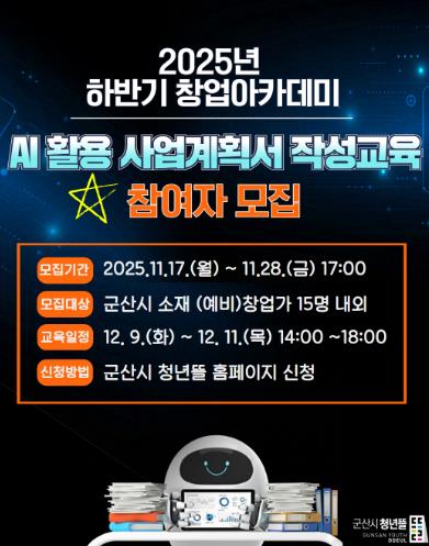 | ▲ 군산시 2025년 하반기 창업아카데미 ‘인공지능(AI) 활용 사업계획서 작성교육’ 참여자 모집 |
