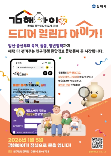 [뉴스스텝] 김해시는 시민 누구나 임신부터 출산, 육아, 돌봄, 청소년, 청년 지원정책까지 한눈에 확인하고 신청할 수 있는 인구정책 종합정보 플랫폼‘김해아이가(家)’를 오는 5일 정식 오픈한다고 2일 밝혔다.