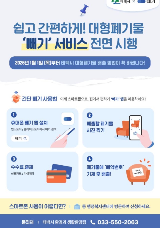 [뉴스스텝] 태백시는 2026년 1월 1일부터 대형폐기물 배출 신청부터 수수료 결제, 처리 결과 확인까지 전 과정을 스마트폰 앱 ‘빼기’를 통해 원스톱으로 처리할 수 있는 서비스를 본격 시행한다고 밝혔다.