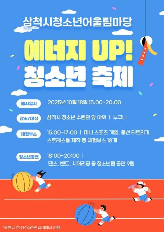 [뉴스스텝] 삼척시청소년수련관은 오는 10월 18일 오후 3시부터 관내 청소년과 가족을 대상으로 2025 삼척시청소년어울림마당 『에너지 UP! 청소년축제』를 개최한다.