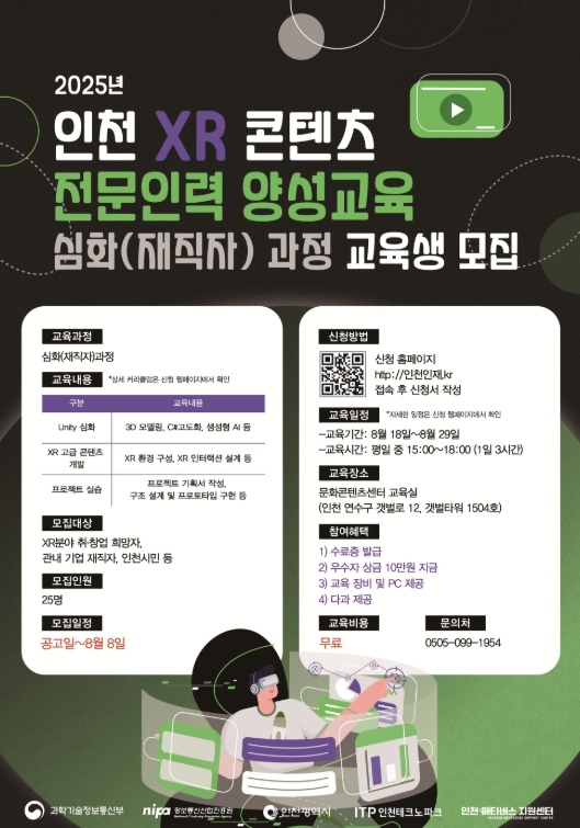 [뉴스스텝] 인천테크노파크(인천TP)는 XR(확장현실) 분야 기업 재직자와 인천 시민을 대상으로 하는 ‘XR 콘텐츠 전문인력 양성교육’ 심화 과정의 교육생을 8월 8일까지 모집한다.