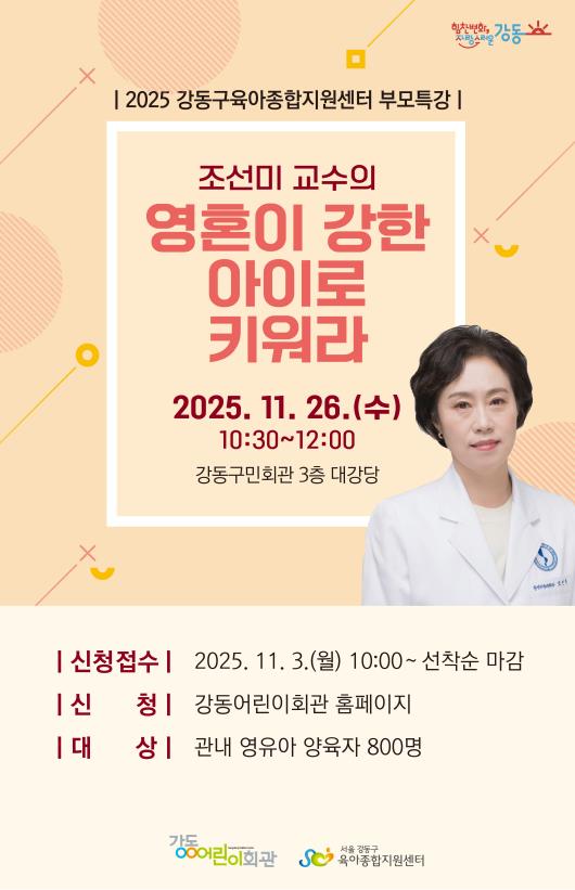 이수희 강동구청장은 “이번 특강은 단순한 양육 지침을 배우는 자리가 아니라, 부모와 자녀가 함께 성장하는 방향을 고민하는 소중한 시간이 될 것”이라며, “변화하는 사회에 맞춰 부모와 자녀 모두가 건강하게 성장할 수 있는 양육 환경을 만들기 위해 다양한 부모 교육 프로그램을 지속적으로 추진하겠다”라고 말했다.