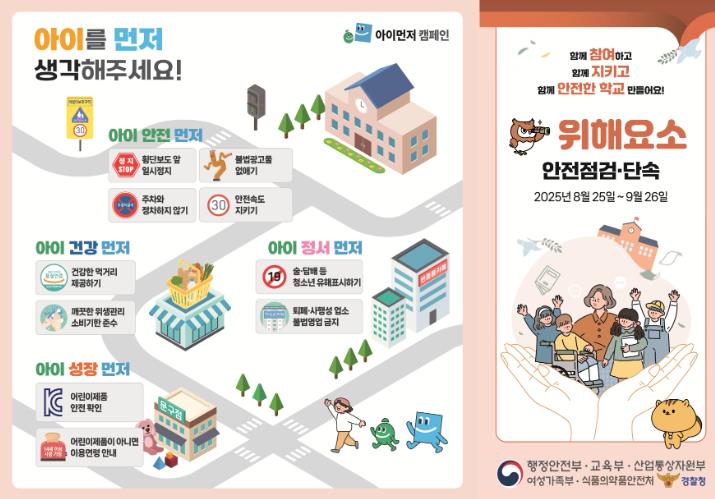 또한, 점검과 함께 군청 누리집, SNS, 현수막 등을 통한 홍보를 추진하고, 민간단체와 함께하는 “아이 먼저 캠페인”을 전개해 어린이 안전 문화 확산에도 힘쓸 계획이다.