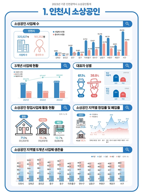 소상공인 통계는 2023년 12월 31일 기준으로 인천시 관내 소상공인의 사업체 규모, 매출, 고용, 업종별 현황 등을 종합적으로 분석한 지역통계다.
