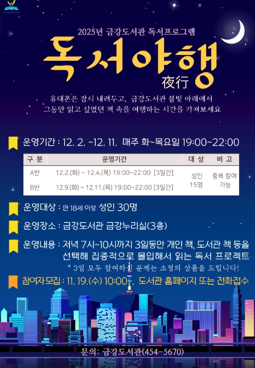금강도서관은 책에 깊이 몰입하고 싶은 성인 30명을 대상으로 12월 11일까지 사이 3일 3시간 동안 ‘독서야夜행行’ 을 준비해, 연말의 분주함 속에서 나만의 조용한 독서 시간을 확보해 깊이 있는 독서를 즐길 수 있도록 배려할 예정이다.