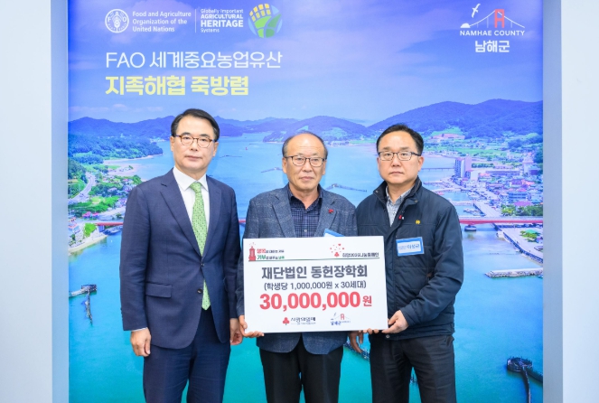 [뉴스스텝] 남해군은 지난 2일 재단법인 동헌장학회(회장 강진용)가 저소득층 학생들을 위한 장학금 3천만원을 기탁했다고 밝혔다.