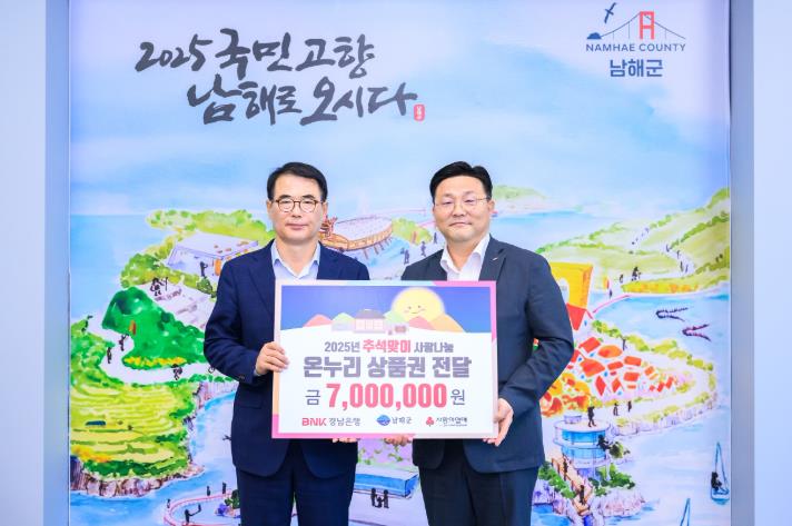 [뉴스스텝] 남해군은 지난 30일 BNK경남은행 남해지점이 추석 명절을 앞두고 700만원 상당의 온누리상품권을 기탁했다고 밝혔다.