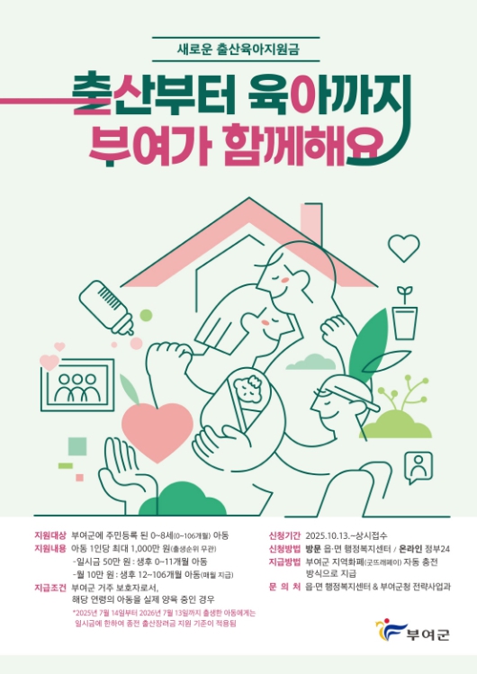 [뉴스스텝] 부여군이 저출산 위기에 대응하기 위해 기존 출산장려금 제도를 ‘출산육아지원금’으로 전면 개편하고, 오는 10월 13일부터 신청을 시작한다.