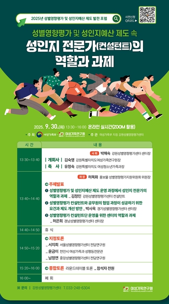 [뉴스스텝] 강원특별자치도여성가족연구원에서는 9월 30일 오후 1시 30분, 온라인 실시간(ZOOM활용)으로 ‘2025년 성별영향평가 및 성인지예산 제도 발전 포럼’을 개최했다.