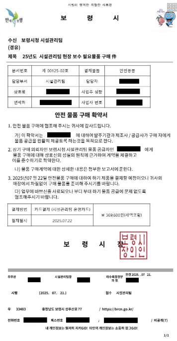 지난 7월에는 ‘2025년도 시설관리팀 현장보수 필요 물품 구매’라는 제목의 위조 공문을 이용한 사기 시도가 있었으며, 이후에도 유사한 사례가 반복되고 있다. 사기범들은 실제 재직 중인 공무원의 실명을 거론하거나 공문서나 명함을 위조해 업체에 선입금을 요구하는 등 수법이 매우 정교해 주의가 필요하다.