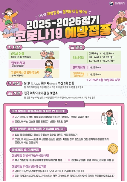 이번 예방접종은 코로나19 고위험군인 65세 이상 어르신, 생후 6개월 이상 면역저하자, 감염취약시설* 입원·입소자를 대상으로 LP.8.1 백신으로 시행된다.