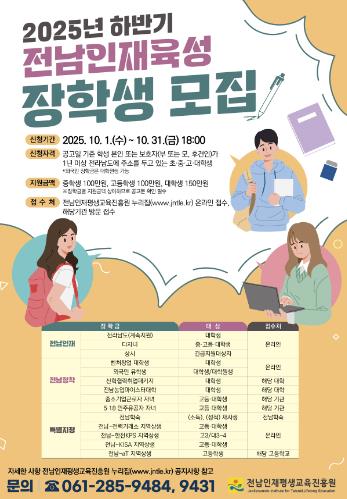 [뉴스스텝] 전라남도와 전남인재평생교육진흥원은 실질적인 교육기회 보장과 미래인재로의 성장, 지역 정착을 지원하기 위한 2025년 하반기 전남인재육성 장학생을 오는 31일까지 모집한다.