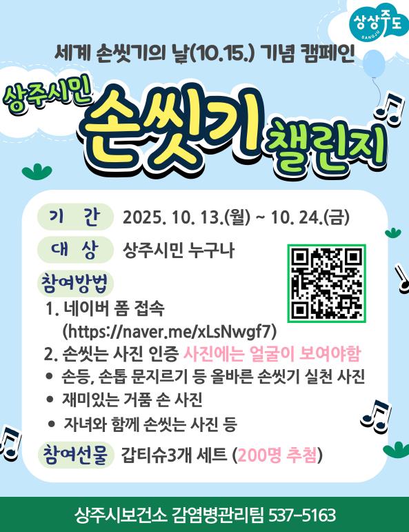 상주시 보건소 관계자는“이번 챌린지를 통해 손씻기의 중요성을 다시 한번 인식하고, 시민 모두가 일상에서 실천하는 계기가 되길 바란다”면서“건강한 상주를 만드는 데 함께 해달라”고 전했다.