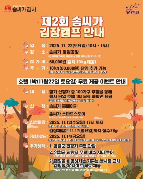 [뉴스스텝] 영월군 상동읍의 청정 지역 김치 브랜드인 농업회사법인 솜씨가는 오는 11월 22일 토요일 오전 9시부터 오후 6시까지 제2회 솜씨가 김장캠프를 개최한다.
