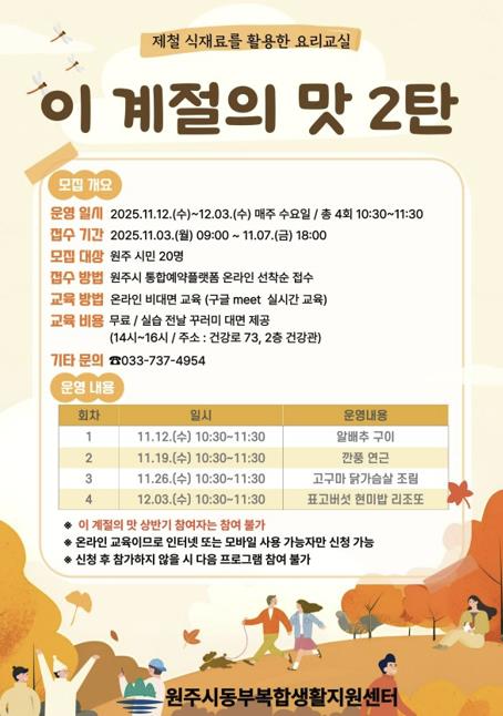 [뉴스스텝] 원주시 동부복합생활지원센터는 오는 11월 3일부터 ‘이 계절의 맛 2탄’ 건강 요리 교실 프로그램 참여자를 모집한다.
