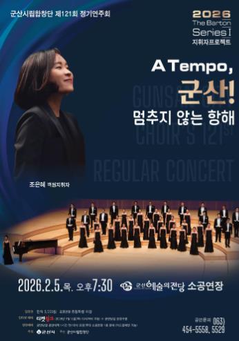 [뉴스스텝] 군산시립합창단이 제121회 정기연주회 〈2026 The Barton Series Ⅰ 지휘자 프로젝트〉 A Tempo, 군산! '멈추지 않는 항해'를 오는 2월 5일 저녁 7시 30분, 군산예술의전당 소공연장에서 개최한다.