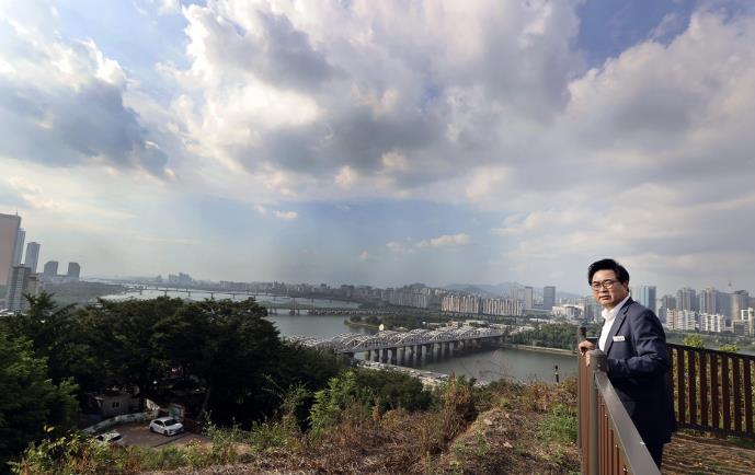 ▲ 박일하 동작구청장이 지난 8월 용양봉저정 공원 전망대에서 안전펜스를 점검하고 있다. |