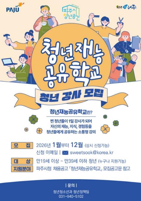 [뉴스스텝] 파주시는 2026년 1월부터 12월까지 청년을 대상으로 '청년재능공유학교' 청년강사를 연중 상시 모집한다.