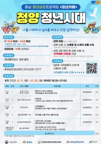 오는 8월 11일부터 3주간 총 5회차로 진행되는 청양 청년시대 4기는 저녁반(18:30~21:00)으로 운영되며, 자기이해부터 실전 취업준비까지 5단계 과정을 통해 청년 개인의 성장을 다방면으로 지원하는 맞춤형 프로그램이다.