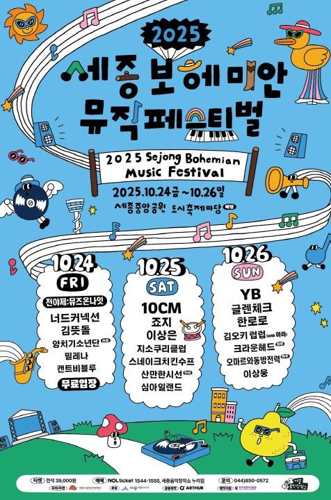 한편 이번 페스티벌의 공식 포스터는 이마트, 네이버 등과의 협업으로 잘 알려진 일러스트레이터 ‘노이신’ 작가와의 협업을 통해 제작됐다. 간결한 그림체와 위트있는 메시지로 주목받아온 노이신 작가는 이번 작업을 통해 세종보헤미안뮤직페스티벌의 정체성과 분위기를 감각적으로 담아냈다. 해당 키비주얼은 포스터뿐 아니라 온·오프라인 홍보물 등에서도 다양하게 활용될 예정이다.