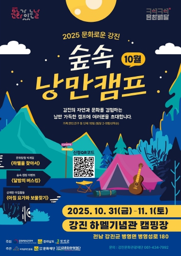 [뉴스스텝] 강진군과 강진군문화관광재단은 2025 문화가 있는 날–구석구석 문화배달 사업의 하나로 ‘캠핑과 함께하는 문화로운 강진’ 2차 행사를 오는 10월 31일부터 11월 1일까지 병영면 하멜 감성텐트촌에서 갖는다.