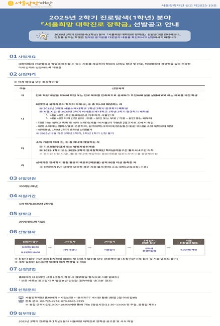 이번 장학금은 서울장학재단이 운영하는 ‘서울희망 대학진로 장학금’ 사업 중 진로탐색 분야로 2025년 2학기에 재학하는 1학년 신입생을 대상으로 한다.