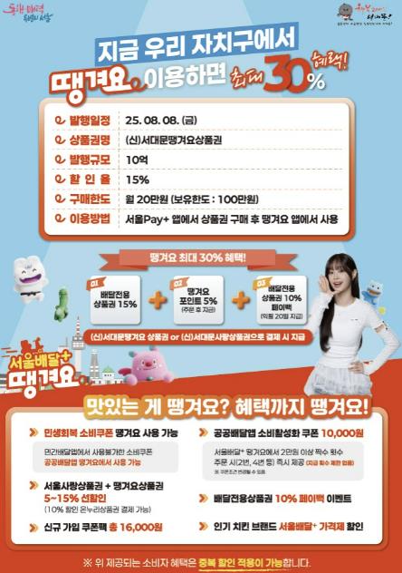 이처럼 서울시와 땡겨요 운영사인 신한은행의 추가 지원으로 ‘서대문땡겨요상품권’이용 소비자는 최대 30%의 혜택을 받을 수 있다.
