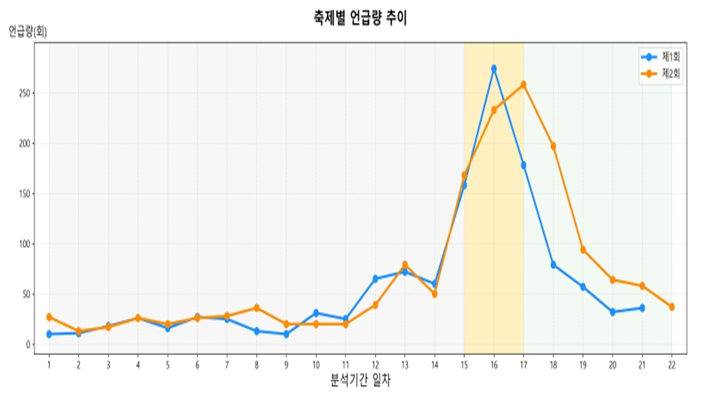 ▲ 제1회, 제2회 ‘쉬엄쉬엄 한강 3종 축제’ 온라인 언급량 추이 비교(축제일인 16일차까지는 두 회차 모두 유사한 언급량을 보였으나, 제2회 축제는 종료 이후에도 온라인 언급이 더 활발하게 이어져 관심이 보다 장기간 유지된 것으로 나타남) |