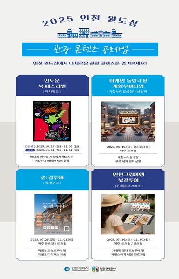 [뉴스스텝] 인천광역시와 인천관광공사는 인천 원도심의 역사·문화와 관광자원, 먹거리 등을 결합한 신규 콘텐츠를 발굴하기 위해 '2025 인천 원도심 관광 콘텐츠 공모'를 추진하고, 최종 4개 사업을 선정했다고 밝혔다.