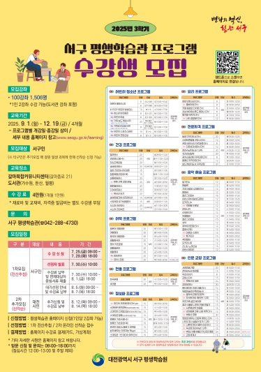[뉴스스텝] 대전 서구 평생학습원은 7월 25일부터 8월 14일까지 ‘2025년 3학기 평생학습관 프로그램’ 수강생을 모집한다고 밝혔다.