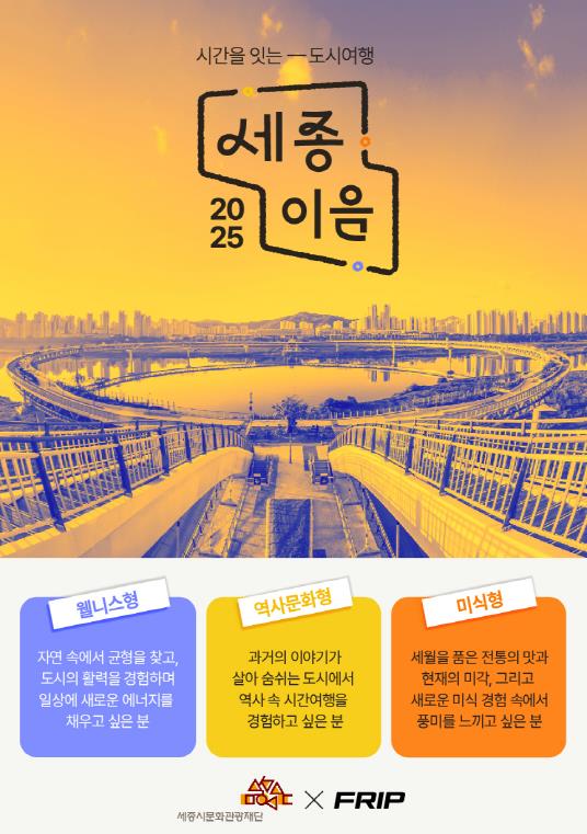 이번 상품은 문화체육관광부와 세종시가 주최하고 세종시문화관광재단이 주관하는 서부내륙권 관광진흥사업의 일환으로 기획됐다. 역사문화형 '세종이음: 세종의 시간, 역사를 잇다', 웰니스형(웰빙+피트니스) '세종이음: 숲과 도시, 쉼을 잇다', 미식형 '세종이음: 세종과 공주, 맛으로 잇다' 총 세가지 테마로 구성되어 있다.