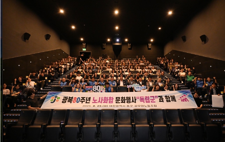 이날 행사는 김제선 중구청장과 이정만 대전 중구 공무원 노조위원장 등 직원 150여 명이 참여했다. 광복 80주년을 맞아 대한민국 독립전쟁사를 다루는 다큐멘터리 영화를 함께 관람하면서 대한민국이 어떤 희생과 헌신 위에 세워졌는지를 되새기고, 공직자로서 함께 나아갈 방향에 대해 논의하고 소통하는 시간을 가졌다.