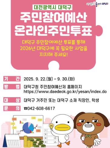 [뉴스스텝] 대전 대덕구는 오는 22~30일 2026년 주민참여예산 사업 선정을 위한 온라인 주민투표를 진행한다고 16일 밝혔다.