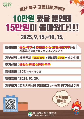 [뉴스스텝] 울산 북구는 추석을 맞아 고향사랑기부제 이벤트를 실시한다고 16일 밝혔다.