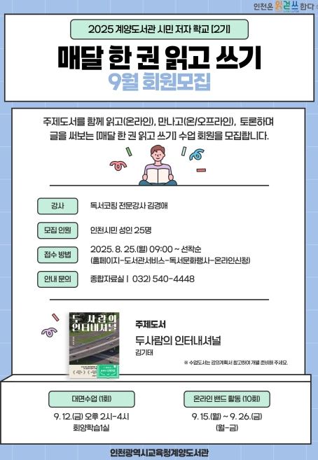 인천광역시교육청계양도서관, 9월 ‘매달 한 권 읽고 쓰기’ 참여자 모집