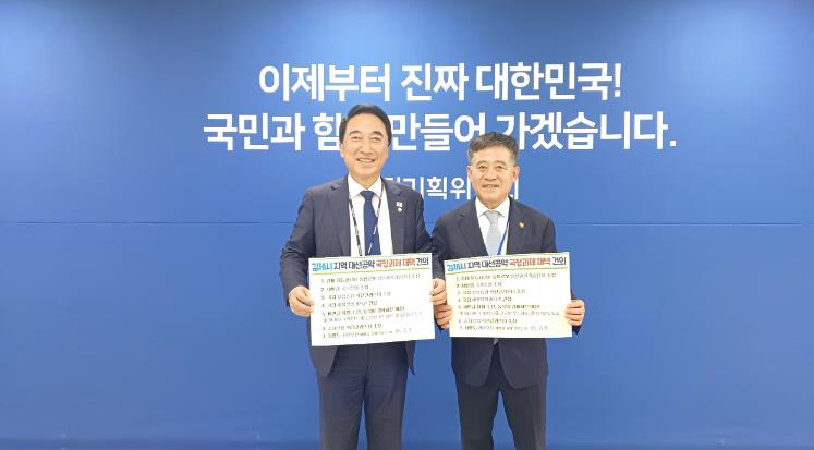 시에 따르면 지난 25일, 정성주 김제시장이 직접 박수현 위원장과의 면담을 통해 김제시 7대 지역 대선공약인 △김제 지능형(AI) 농업로봇 첨단과학기술단지, △새만금 국가정원, △국립 치유농업 혁신클러스터, △해양생명과학관, △차질없는 새만금 사업 추진(새만금 RE100 국가산업단지, 새만금 글로벌 푸드허브, 새만금 남북3축 도로), △종자산업 혁신클러스터, △지방도 702호선(새만금~김제~혁신도시) 국도 승격에 대해 국가균형발전 차원에서 국정과제 세부 실천 과제로 반영해 줄 것을 절실히 건의했으며, 박 위원장 역시 지역의 목소리가 반영될 수 있도록 최선을 다하겠다고 화답했다.