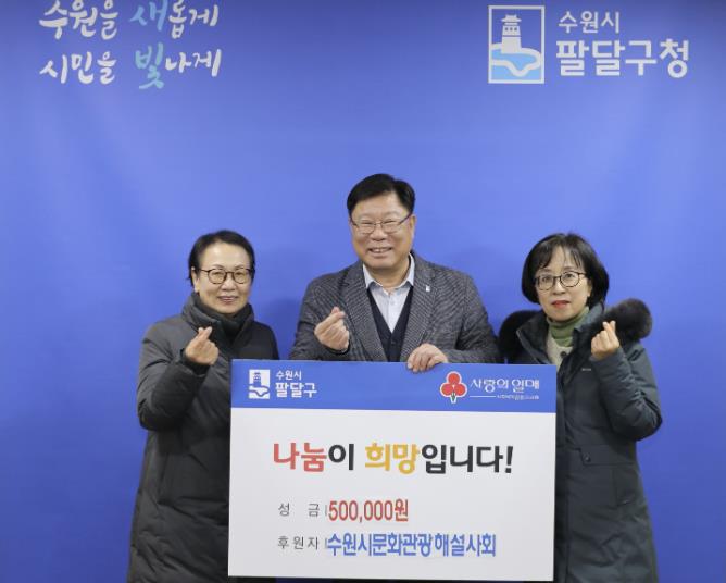 이상균 팔달구청장은 “해마다 변함없이 팔달구를 위해 따뜻한 나눔을 실천해주시는 수원문화관광해설사회에 깊이 감사드린다”며 “기탁해주신 성금은 꼭 필요한 이웃들에게 소중히 전달하겠다”고 밝혔다.