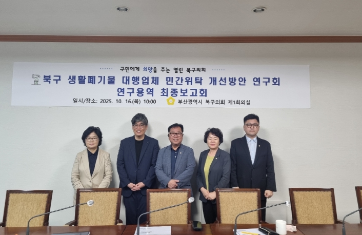 [뉴스스텝] 부산광역시 북구의회 의원연구단체 ‘북구 생활폐기물 대행업체 민간위탁 개선방안 연구회’(대표의원 임성배)가 10월 16일 오전 10시,‘북구 생활폐기물 민간위탁 개선방안 연구용역’최종보고회를 개최했다.