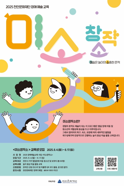 [뉴스스텝] 천안문화재단은 오는 8월 17일까지 발달장애 아동을 위한 예술교육 프로그램 ‘미소창작소’의 참가자를 모집한다고 4일 밝혔다.