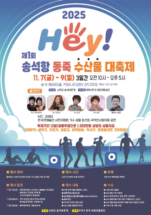 [뉴스스텝] 서천군 마서면 송석어촌계가 11월 7일부터 9일까지 사흘간 송석항 일원에서 ‘제1회 헤이(HEY) 송석항 동죽 수산물 대축제’를 연다.