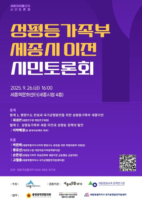 이번 토론회는 행정수도 완성을 위한 성평등가족부의 세종시 이전 필요성과 성평등 정책 추진체계 강화를 공론화하기 위한 자리로, 국회·광역·기초의원, 성평등정책 전문가, 지역 활동가, 여성단체와 시민 등이 참여할 예정이다.