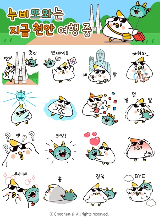 카카오톡 이모티콘 16종은 11일 오후 2시에 무료 배포되며, 카카오톡에서 ‘천안시 관광’ 채널을 추가하면 선착순으로 내려받을 수 있다.