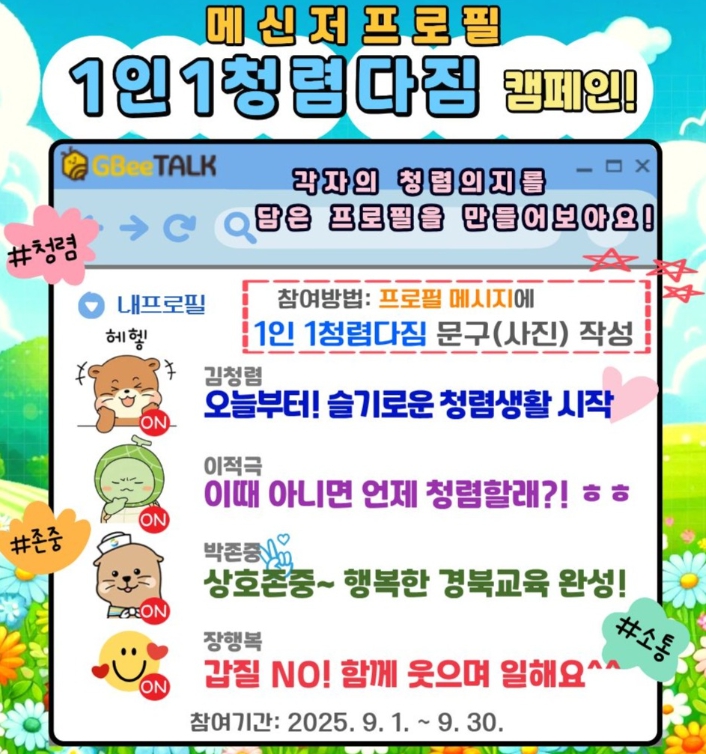 이번 캠페인은 모든 직원이 사용하는 업무용메신저 프로필에 ‘1인 1청렴다짐 문구’를 스스로 작성하고 공유함으로써, 일상 생활속에서 자연스럽게 청렴의 의미을 되새기고 실천할 수 있도록 마련됐다.