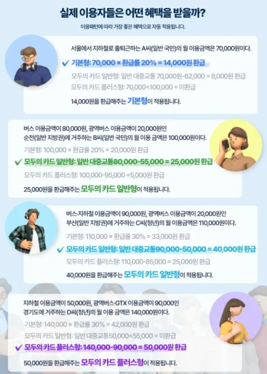 일반형은 1회 총 이용요금이 3,000원 미만인 수단에만 적용되고, 플러스형은 모든 수단에 대해 환급 적용된다.